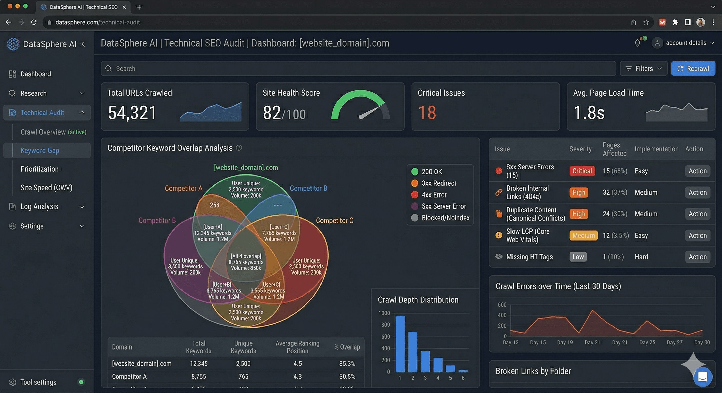 AI audit platforms use machine learning to understand which technical issues are most likely to suppress rankings for your specific site and niche. They identify patterns across thousands of similar sites to give context-aware recommendations — not just a generic list of errors.