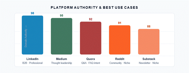 Match platform authority with your audience. LinkedIn for B2B; Medium for thought leadership; Quora for FAQ-intent queries; Reddit for community-driven topics. Industry directories can outperform general platforms for niche searches.