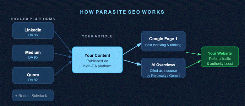 Fig. 1 — How Parasite SEO channels the authority of high-DA platforms into Google rankings, AI citations, and referral traffic for your own site.