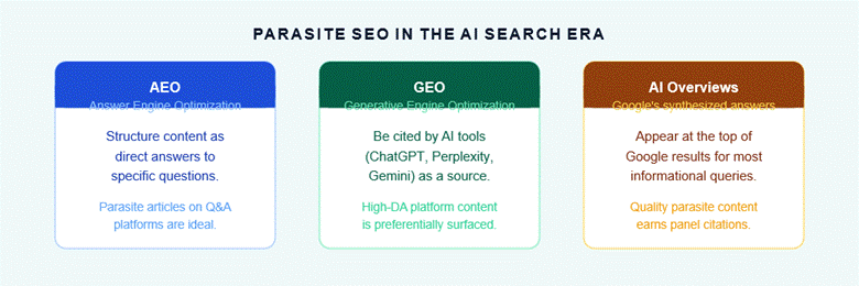 Fig. 3 — Parasite SEO sits at the intersection of AEO, GEO, and Google AI Overviews — the three emerging pillars of AI-driven search visibility in 2026.